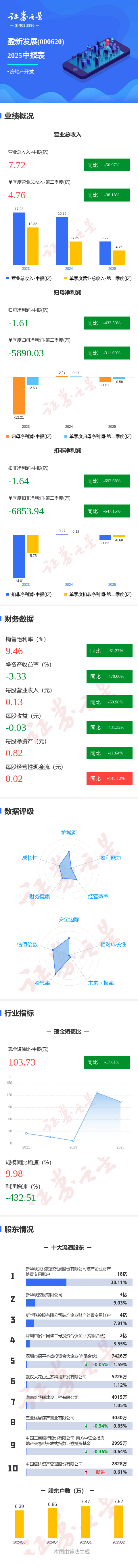 证券之星消息,盈新发展2025年中报显示,公司主营收入7.72亿元,同比下降50.97%;归母净利润-1.61亿元,同比下降432.51%;扣非净利润-1.64亿元,同比下降692.68%;其中2025年第二季度,公司单季度主营收入4.76亿元,同比下降38.18%;单季度归母净利润-5890.03万元,同比下降311.7%;单季度扣非净利润-6853.94万元,同比下降647.17%;负债率56.6%国内在线配资,投资收益-132.8万元,财务费用4220.63万元,毛利率9.46%。