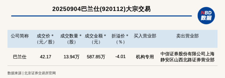 每经讯,2025年9月4日,北交所上市公司巴兰仕(920112,收盘价:43.93元)发生一笔大宗交易,成交价42.17元/股,成交数量13.94万股,成交金额587.85万元,折价4.01%。买入营业部是机构专用国内在线配资,卖出营业部是中信证券股份有限公司上海静安区山西北路证券营业部。