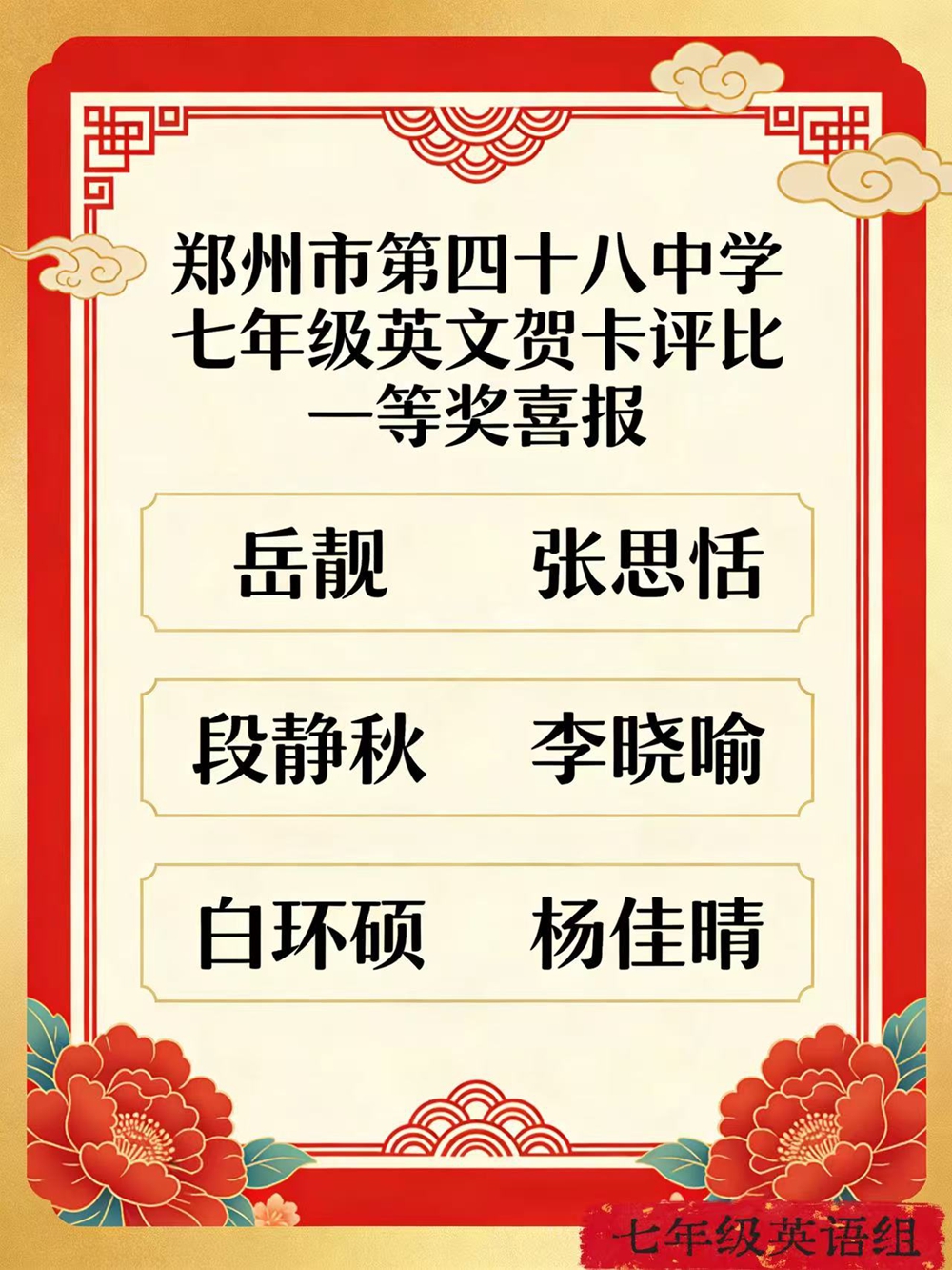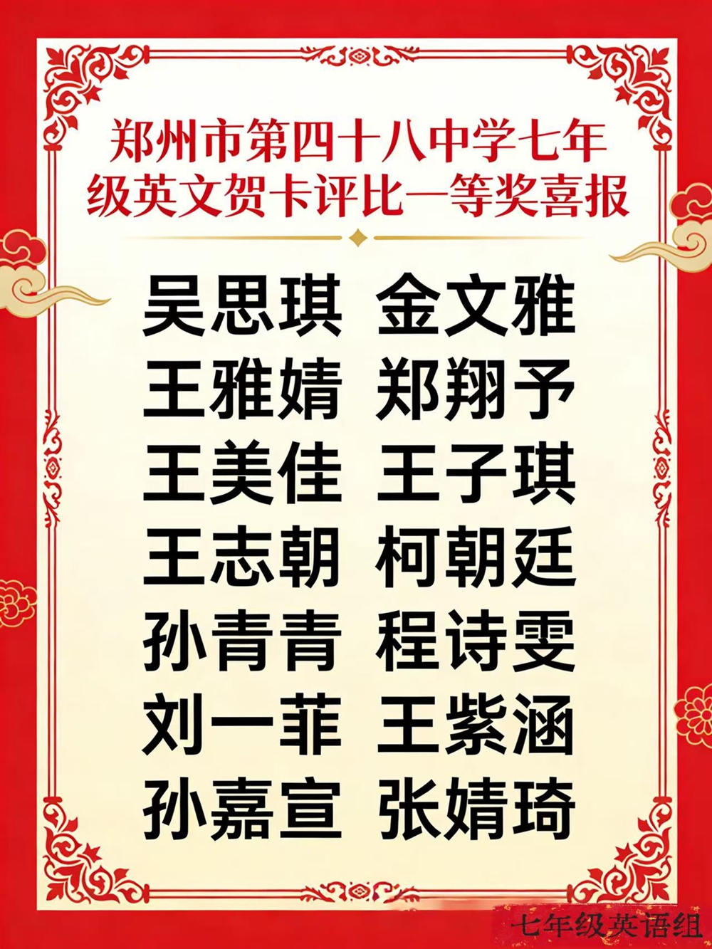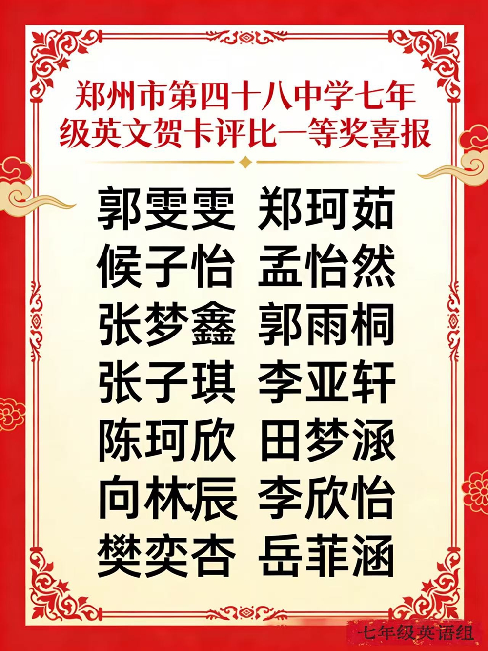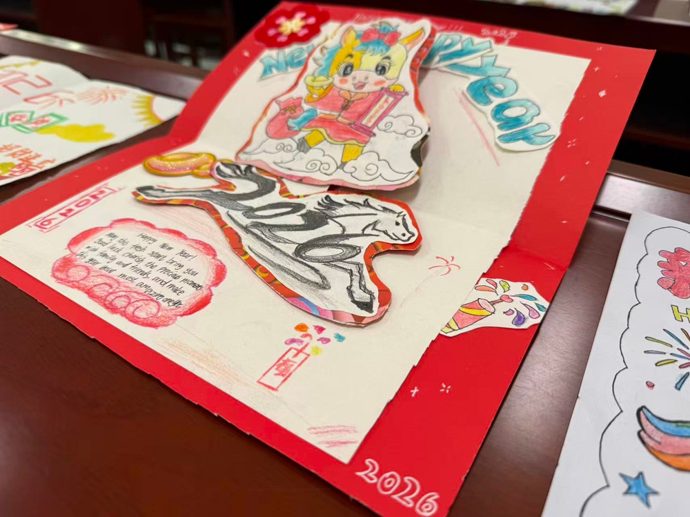 为深化英语学科实践,推动语言学习与中华优秀传统文化深度融合,丰富学生寒假生活,依托学校加入外语学校教研合作组织的优质资源平台,郑州市第四十八中学七年级精心组织“英文创意贺卡制作与优秀作品评选”活动。本次活动以贺卡为载体,让学生在动手实践中活用英语、感受文化,切实落实学以致用、以美育人的教学目标,彰显我校英语特色办学与文化育人的融合成果。