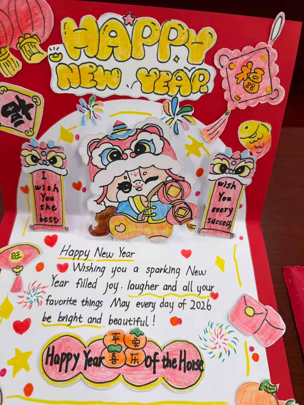 寒假期间,七年级同学们积极参与、精心创作,将新春祝福、传统年俗、家国情怀与规范英语表达巧妙结合。同学们充分运用彩纸、剪纸、绘画等传统工艺元素,搭配流畅工整的英文祝福语,把中国年的喜庆氛围、对家人师长的感恩之情,以双语形式生动呈现。一张张贺卡设计精美、创意十足,既展现出扎实的英语基础,又饱含浓郁的中国年味,充分体现了四十八中学子的创新思维与文化自信,也是学校依托外语教研合作平台,提升学生综合语言运用能力的鲜活实践。